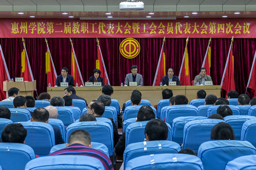 本网讯 3月27日下午,为期三个半天的惠州学院第二届教职工代表大会暨工会会员代表大会第四次会议圆满结束。在家校领导彭永宏、赵日兴、李韶春、许玩宏、刘国栋出席会议并在主席台就座。校党委副书记兼纪委书记、工会主席李韶春主持会议。