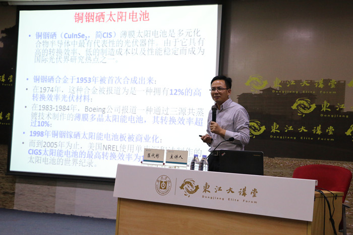 匡教授从贴近生活的常见疾病——癌症切入主题,呼吁大家重视生活中的化学。他对能源的现状及需求进行了分析,再基于无机纳米线阵列的染料敏化太阳能电池详细讲解了半导体薄膜材料及太阳电池的利用,重点对非晶硅薄膜太阳能电池、铜铟硒薄膜太阳能、电池铜铟稼硒薄膜太阳能电池、和碲化隔薄膜太阳能电池这四类太阳能电池进行了详细的介绍。匡教授还拓展介绍了有序钙钛矿大孔薄膜薄膜的制备及其在钙钛矿太阳能电池中的应用。匡教授认为,太阳能的应用对我们的未来生活将会产生极大的影响。