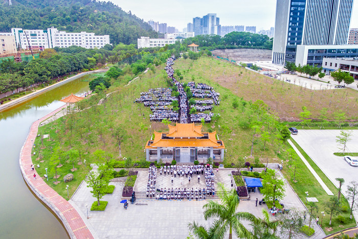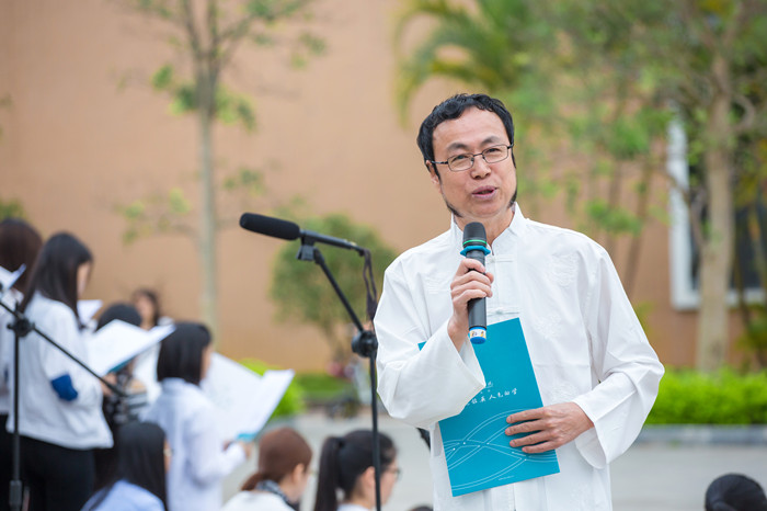活动开始,经管学院党总支负责人首先致辞。他引经据典,以国学名言告诫学子们应多读书、读好书、做好人,使读书成为一辈子的事业,让自我得到升华,成为一名有担当、有家国情怀的大学生。随后,在惠州电台副台长赵越女士的带领下,全体师生统一着装,精神抖擞,齐声朗读儒家经典《大学》,以“书”字繁体字为模版的朗诵方阵铿锵有力、书声琅琅,千人诵读、传承经典的画面顿时呈现在眼前!