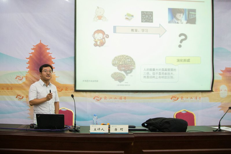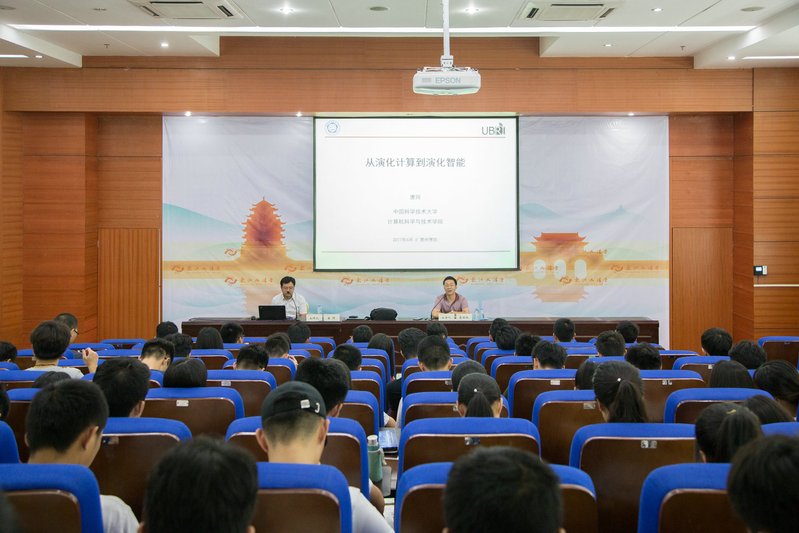 唐教授从演化计算的起源、功能、现状这三大方面出发,为同学们讲述了“从演化计算到演化智能”的演变过程。他首先分析了智能起源于演化的论断,并用图灵的“用演化的方式实现智能的”构想加以论证。谈及演化计算,唐教授具体阐释了演化计算的本质、功能,指出演化计算作为一种解决问题的工具,本质是基于种族的迭代试错(搜索),为我们提供了平台、算法、应用。他以优化问题为例,指出了演化算法试用的问题类型,并以鸟巢的结构设计、大多数多极值问题、多目标问题等具体问题为例,具体演示了演化算法的应用,指出演化算法比其他算法具备更加优越的理论特性,开拓了同学们演化计算的思路。