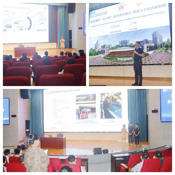 校企合作企业代表、德国大陆集团独资子公司——大陆马牌轮胎(中国)有限公司人力资源总监孙怡女士,“大陆班”项目校方负责人吕刚老师,分别作了题为“从企业层面看‘双元制’高等教育培养模式”“借鉴德国‘双元制’教育模式,探索人才培养新机制”的专题报告,详细介绍了德国大陆集团与合肥学院校企合作模式的成功实践及合作成效;学生代表侯世豪、刘延涛分享了“大陆班”学习的感受与体悟。