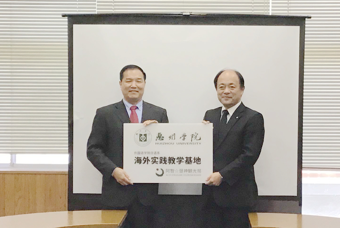 到访日本的第三站是长野县阿智村政府及昼神观光局。自2019年1月我校与阿智村昼神观光局签订合作协议以来,双方就构建惠州学院海外实习基地事宜开展了行之有效的合作。从今年7月开始,我校派出第一批日语专业实习生共17人赴阿智村政府及所辖区域的观光旅游类企业开展实习。通过为期半年的实习,学生一方面能增强日语运用能力,另一方面又能开阔国际视野,提升国际竞争力与跨文化交际能力,达到了国际协同联合育人的目标。11月15日上午,我校代表团访问了阿智村政府,受到阿智村村长熊谷秀树、村政府地域经营课长棚田益弘、阿智昼神观光局董事长白泽裕次、专务理事小岛嘉治、企画战略部牛山敦志等的热情欢迎。座谈会上,我校与阿智村政府进行了“惠州学院海外实践教学基地”授牌仪式,标志着我校首个海外实践教学正式成立。座谈会后,我校代表团还热情看望了正在该地实习的我校学生。