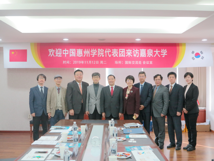 韩国嘉泉大学成立于1939年,地处韩国首都首尔以南的城南市,是韩国一所教育部直属的四年制私立综合性研究型大学。该校在80年的发展过程中为韩国的高等教育和医药发展作出了卓越贡献,成为首都圈大学中的有力竞争者。城南市与惠州市也是姐妹城市。在城南市与惠州市双方政府的促成下,我校代表团于11月12日上午到访嘉泉大学,受到该校国际交流处处长崔景津博士、学生处处长暨体育学部教授朴尚勇博士、东亚文化学科教授暨亚洲文化研究所所长朴真秀教授、国际交流院部长李秉俊等的热情欢迎。双方就韩语合作教学、韩国语师资支援、学生交流学习、教师访学与培训、联合科研等开展了热烈讨论,并重点就两校如何在音乐和体育领域,包括声乐、器乐、作曲专业与体育、跆拳道专业等开展初步交流合作进行了具体商讨。我校还邀请对方派出音乐、体育、演艺专业等师生代表参加我校明年的“惠州学院第二届国际文化节”,希望高校率先借助音乐、体育打破语言壁垒与文化障碍,为构建两校之间的友好合作关系迈出坚实的第一步。座谈会后,两校正式签署了合作协议。