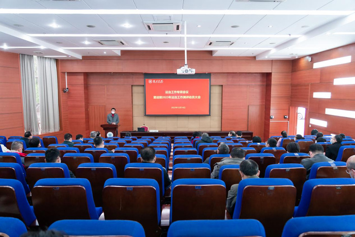 本网讯 12月14日上午,学校法治工作专项会议暨迎接2023年法治工作测评动员大会在文城会议厅召开。全体校领导、各职能教辅部门负责人、各二级学院党政负责人及学校法律顾问参加会议。会议由校党委副书记车小真主持。