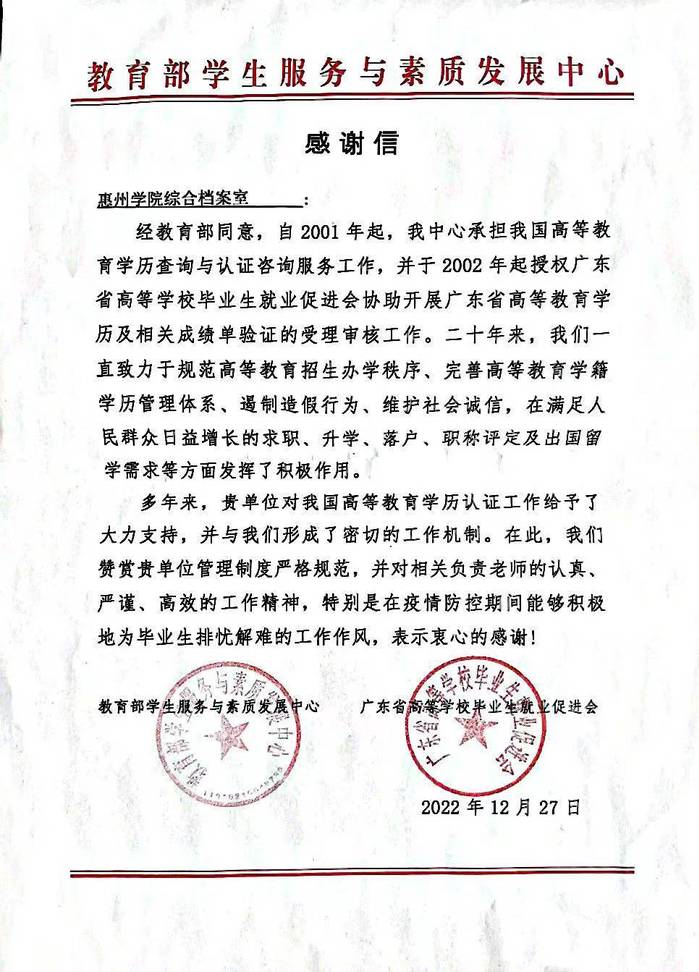 本网讯 日前,教育部学生服务与素质发展中心、广东省高等学校毕业生就业促进会联合给我校综合档案室发来感谢信,赞赏我校档案管理制度严格规范,并对我校综合档案室大力支持我国高等教育学历认证工作,以及相关负责老师认真、严谨、高效的工作精神,特别是在疫情防控期间积极为毕业生排忧解难的工作作风表示感谢。