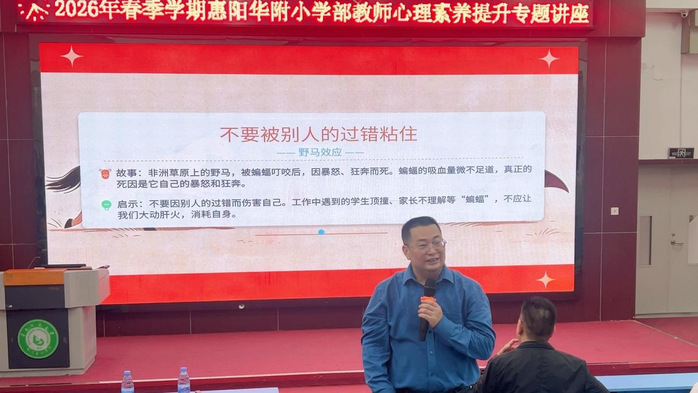 本网讯 为深入贯彻落实“双百行动”工作部署,深化校地心理育人合作,提升中小学教师心理健康素养与自我关怀能力,4月8日下午,我校心理健康教育与咨询中心常务副主任何资桥副教授、专职教师刘琼受邀前往华南师范大学附属惠阳学校,分别面向小学部、中学部教师开展心理健康主题讲座。