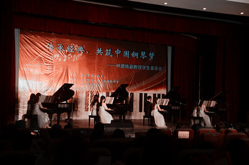 音乐会在八手联弹《花之圆舞曲》中震撼开场,林碧炼副教授的11位学生演奏了《诗人的心》、《德彪西冥想曲》、《安达露萨舞曲》、《翻身的日子》等19首中外名曲。四台钢琴合奏《我和你》将音乐系师生的心紧紧连在一起、将学生的“学业梦”与国家的“中国梦”连在一起,表达了同学们共筑“中国梦”的伟大决心。激昂的十六手联弹《蓝色幻想曲》带领大家领略了钢琴经典的音乐旋律,恢弘的气势、大气的场面赢得现场观众阵阵热烈掌声。