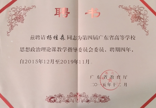 本网讯 我校杨桂森教授是广东省高校思想政治理论课第二批名教师培养对象,去年底经省教育厅专家组评审通过终期验收。日前,省委教育工委、省教育厅正式下发文件,同意杨桂森教授结束名教师培养工作,授予其“广东省高等学校思想政治理论课名教师”称号,同时聘请杨桂森教授为第四届广东省高等学校思想政治理论教学指导委员会委员。 撰稿:思政部 文/图 审稿:雷吉来 审核:金伟 签发:赵日兴