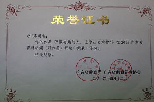 本网讯 近期,由广东省教育厅、广东省教育记者协会主办的2015年广东省教育好新闻(好作品)颁奖会暨广东教育宣传联席会在广州举行。我校作品《“做有趣的人,让学生喜欢你”》荣获二等奖,这也是我校首次参评此类评选。