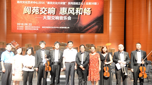 本网讯 2016年6月22日晚,惠州学院交响乐团在惠州市文化艺术中心举办了一场“阆苑交响 惠风和畅”大型交响音乐会。此次音乐会由惠州文化艺术中心主办,惠州学院音乐系承办的“惠民文化大讲堂”系列活动之一,也是学院交响乐团赴北京音乐厅演出前的热身预演,吸引了近千市民聆听,惠州学院党委刘晟书记、赖美琴副校长及部分师生也到场欣赏。