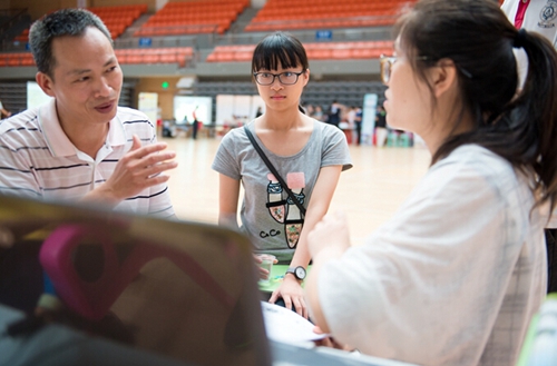 南都讯 昨日,广东2016年高考成绩放榜,高考录取分数线出炉,填报志愿成了考生与家长的当务之急。今日上午9时,惠州学院校园开放日暨本科招生咨询会活动在金山湖体育馆举行,校方现场为前来咨询的考生和家长答疑解惑,提供该校招生政策、招生计划和专业学习等情况介绍。