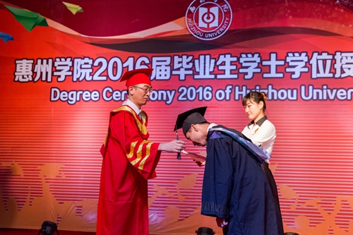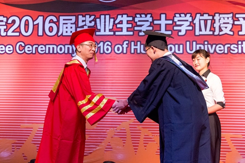 仪式上,彭永宏校长亲切地与毕业生们一一地握手,毕业生微躬身接受校长拨苏,接过校长颁发的学位证书,与校长合影留念,用照片定格这难忘的时刻。在各场次学位授予仪式上,各系系主任分别寄语毕业生。授予仪式结束后,全体学生起立,高唱校歌,为仪式画上圆满的句号。