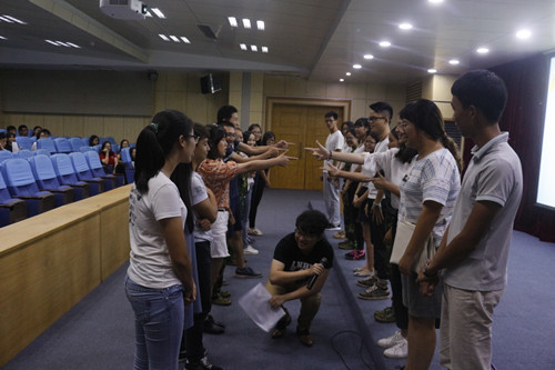 在讲解完相关理论知识后,许老师邀请同学们上台参与团体辅导的操作演示。在该环节中,他对照团辅活动的创始、过渡、工作和结束四个阶段带领二十多位同学进行体验,期间还介绍带领团辅的要诀,以及团辅过程中可能遇到各类情况的应对和处理方法,让大家对接下来自行组织团辅有了更多的经验储备和心理准备。