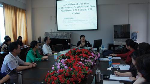 王敬慧教授从100多年前澳大利亚作家E.W. 科尔的作品《中国人性格好的一面》出发,通过文本分析指出,尽管许久以来,基于许多原因,其它文化对中国文化或中国人的认识了解不全面甚至不正确,但仍有不少有识之士显示出对异文化的包容与理解,这种主张在当代澳大利亚著名作家、诺贝尔文学奖获得者J.M.库切的作品里得到遥相呼应。曾院长在总结时认为,此次报告让我们的老师领略到王敬慧教授对澳洲文学与文化研究的深厚功力,同时,也让大家体会到通过文学文本研究文化的路径和方法,这尤其对青年教师们具有方法论的启发意义。