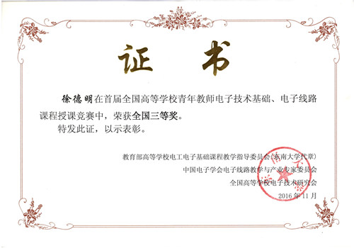 本网讯 11月19日至20日,首届全国高等学校青年教师电子技术基础、电子线路课程授课竞赛决赛在北京航空航天大学举行。惠州学院电子信息与电气工程学院徐德明老师荣获中南赛区一等奖,并代表中南赛区参加全国总决赛,最终荣获全国三等奖。