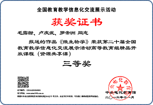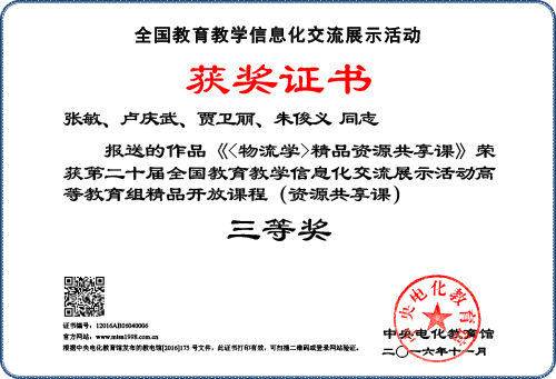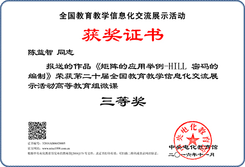 本网讯 近日,由中央电化教育馆主办的第二十届全国教育教学信息化交流展示活动(原全国教育教学信息化大奖赛)落下帷幕。由我校教育技术中心和人事处联合组织报送的教师参评作品,经济管理学院张敏老师主持的《物流学》精品资源共享课、数学与大数据学院陈益智老师的微课《矩阵的应用举例-HILL密码的编制》和生命科学学院毛露甜老师主持的《微生物学》精品资源共享课分别荣获三等奖。 获奖证书 获奖证书 获奖证书 撰稿:陈芸 审稿:卢庆武 审核:金伟 签发:赵日兴