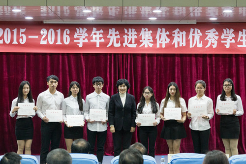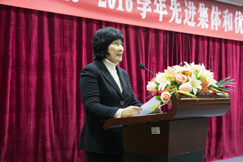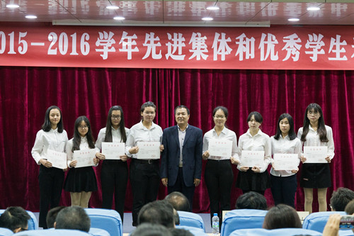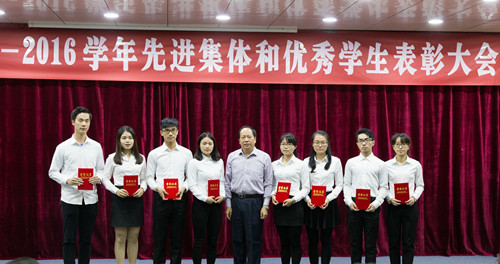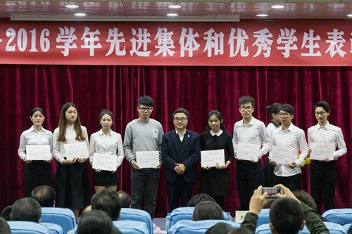 本网讯 12月23日下午,我校在图书馆报告厅举行2015-2016学年先进集体和优秀学生表彰大会。校党委副书记赵日兴、李韶春,副校长许玩宏、罗川山,各二级学院党总支负责人,全体辅导员,相关部门负责人及获奖学生代表参加了会议。会议由校学生处处长谭润志主持。