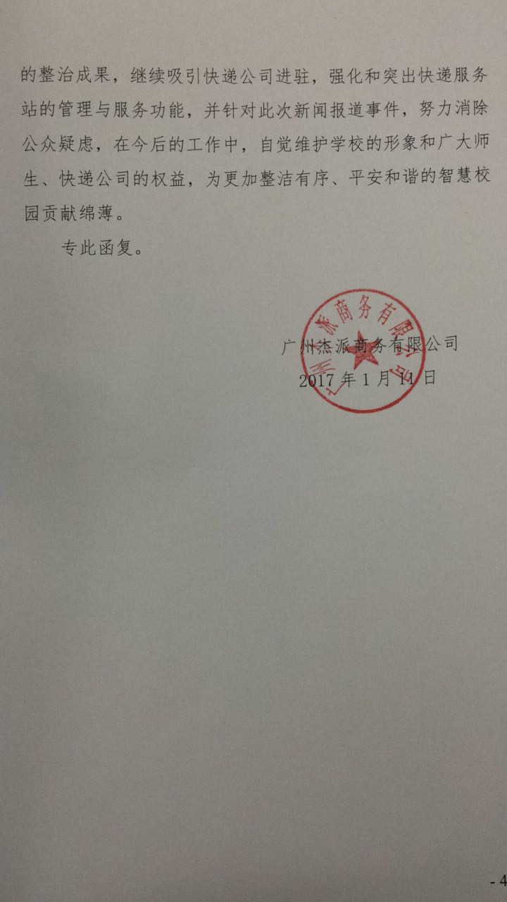 附件:1.广州杰派商务有限公司关于应答校园快递管理服务有关问题的复函