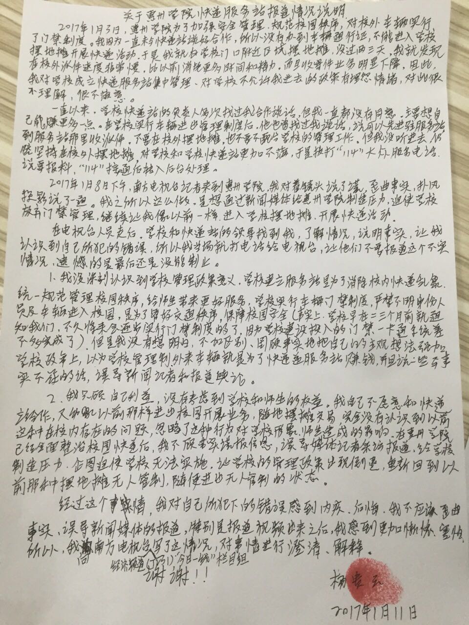 1月10日,我校通过校园网、微信公众号等平台发布了《关于惠州学院校园快递管理服务有关情况的通告》,初步回应了媒体与社会对校园快递管理服务的关切。通告发布后,仍有部分师生对服务站的具体运作存有疑问,为进一步澄清事实、释疑解惑,学校要求服务站经营方广州杰派商务有限公司对反映集中的问题给予正式的书面说明。学校希望通过杰派商务有限公司与各快递公司的合作,给师生提供更加放心安全的校园快递管理服务。学校会关注各方的诉求,依法依规,协调解决可能出现的问题,切实维护校园和谐与稳定。1月11日,杰派公司给学校正式回函,爆料人杨贵云先生也就报道情况作了说明,让我们一起来听听他们的声音吧。