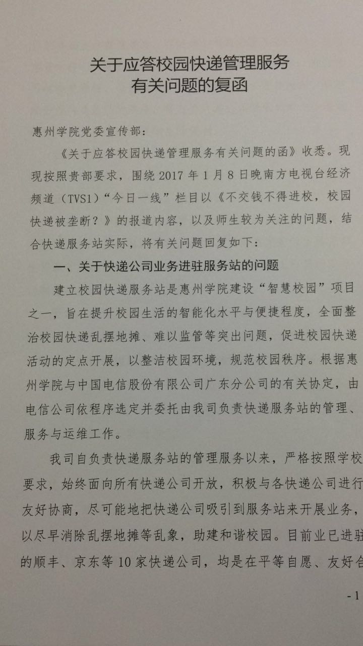 《关于应答校园快递管理服务有关问题的函》收悉。现按照贵部要求,围绕2017年1月8日晚南方电视台经济频道(TVS1)“今日一线”栏目以《不交钱不得进校,校园快递被垄断?》的报道内容,以及师生较为关注的问题,结合快递服务站实际,将有关问题回复如下: