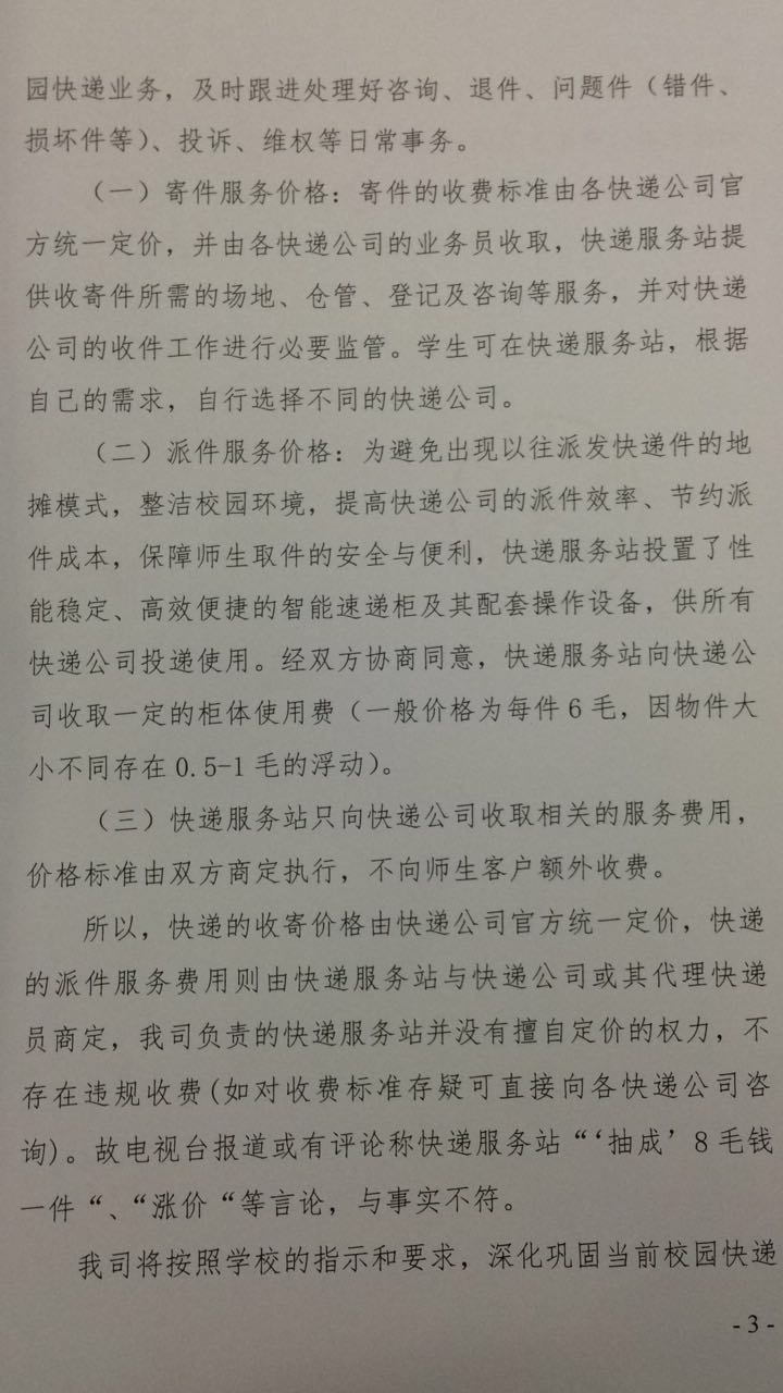(三)快递服务站只向快递公司收取相关的服务费用,价格标准由双方商定执行,不向师生客户额外收费。