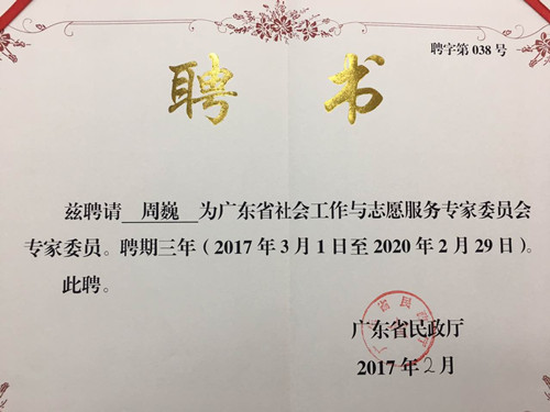 据悉,周巍老师2014年度曾被中国社会工作联合会评为“中国十大社工人物”;2015年被民政部评为首批全国专业社会工作领军人才;2017年在共青团广东省第十三届委员会第六次全体(扩大)会议上被选为团省委委员。