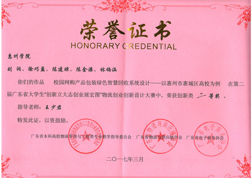 此次大赛以“创新立大志创业展宏图”为主题,旨在加快高素质物流人才队伍建设,满足物流企业发展对人才的需求,同时加强各高校师生间之间的交流,提高我省物流专业大学生的综合素质,促进产学研及校企合作。大赛吸引了来自包括华南理工大学、中山大学、华南师范大学、广东工业大学、广州大学等省内知名高校的近百支队伍参赛,经过校内选拔赛、复赛和决赛三个阶段,最终共有20支参赛队进入决赛。经过师生们的共同努力,我校经管学院选拔的3支参赛队经受住重重考验,最终2支队伍进入复赛、1支队伍进入决赛。其中,“苹果小分队”凭借参赛作品《校园网购产品包装绿色智慧回收系统设计》最终在创新组总决赛共11支参赛队伍中以总成绩排名第5的成绩荣获大赛二等奖。