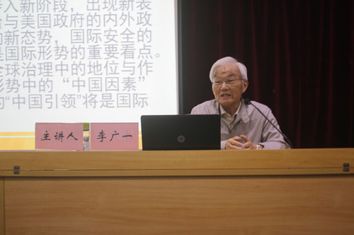 李教授就以“乱变交织”四个字高度概括2017年国际形势,并通过四方面进行了阐述:一是特朗普上台与美国政府的内外政策;二是大国博弈的新态势;三是国际安全的多重挑战;四是国际形势中的“中国因素”与国际治理中的“中国引领”。他分析了美国新总统特朗普竞选成功的原因,帮助大家简要了解美国的选举方式;结合生动的政治案例,进一步阐述了特朗普政府的内外政策,认为美国目前的对内政策将进一步深化社会分裂和对立,对外政策将凸显“美国利益至上”的孤立主义。