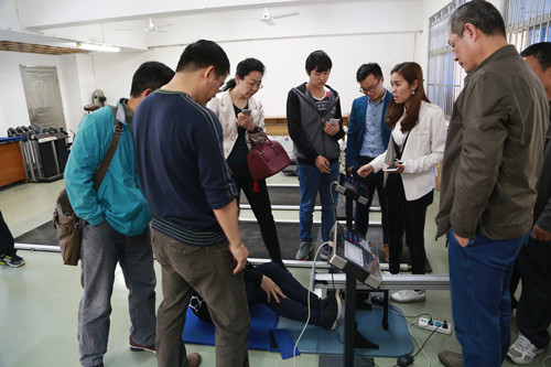 随后,在徐主任等的带领下,我校一行参观了广东金融学院学生体质健康测试中心,体验了该校大学生体质健康测试工作的流程,详细了解了专业体质测试仪器、体质测试管理系统的优势和使用方法、云平台的开发使用等情况。徐焰主任介绍说,先进的仪器不仅提高了测试的效率、节省了人力成本,而且能够提高测试的准确性,真实地反映和反馈学生体质状况,对开展有针对性的体育教学具有积极的作用。他还回答了我校教师关于数据导入、成绩分布统计以及如何快速办理学生体质补测等相关问题。