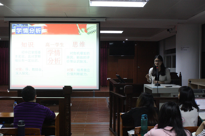 讲座开始前,嘉宾们与政法学院负责人、历史系全体教师进行了座谈,就目前中学历史的教学现状、人才培养等进行了热烈的讨论,就双方今后的合作进行了规划。随后,历史系全体师生在我校培训楼四楼聆听了雷军训老师的讲座。雷老师以幽默风趣的方式向在场师生展示了一节生动活泼的历史课堂。他以《高中历史(必修三)》第二十九课为例,以故事导入,由简到易,层层深入,用其丰富的教学经验和深厚的知识底蕴,展示了一节优秀的历史课堂。雷老师还分享了“好课堂”的标准,并对如何提高师范生教学、管理技能提出了具体的指导性意见,赢得了在座师生的热烈掌声。