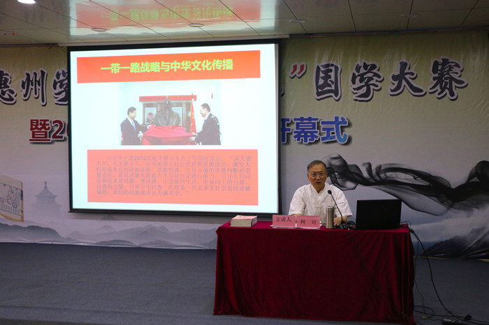 在随后的国学大赛讲堂上,国学专家柯可教授以“国学智慧与美好人生”为题,解读了国学教纲、“十二德”和“五智慧”等内容,指出“易为学纲、儒为礼纲、佛为心纲、道为主纲”,就“仁、义、礼、智、信、勇、孝、悌、忠、俭、廉、和”等“十二德”,及“人生、道德、思维、变化、和谐”等五智慧进行了讲解。讲堂结束后,在场师生还与柯教授进行了热烈的探讨和交流。