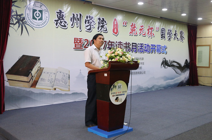 刘国栋副校长在开幕式上致辞,并宣布惠州学院第二届“乾元杯”国学大赛暨2017年读书月活动开幕。他在致辞中以培根《论读书》为例,强调读书要讲究方法。他从为什么要读书、怎样读书、读哪些书等方面,阐释了阅读的重要性;劝勉同学们应利用大学时光多阅读,要多做笔记、多讨论,在多读史、诗的同时兼顾数学、科学、伦理学、逻辑学等学科知识,从而不断充实自己;希望我校第二届国学大赛与读书月活动的举办,能进一步营造良好的校园文化氛围,以提高学生综合素质。刘副校长强调,国学是中国的精神、灵魂、血脉,我们应继承和弘扬国学经典,使之得以传承和发展。