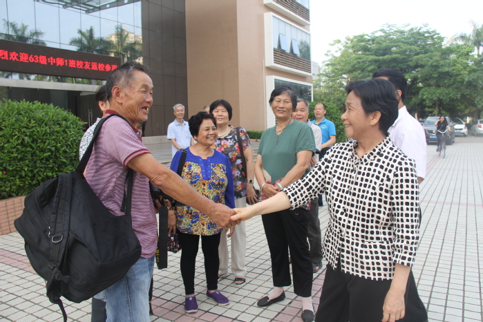校友们参观了校史馆、图书馆、蓬瀛湖等崭新美丽的校园。赖美琴副校长向校友们介绍了学校的办学基本情况和发展规划,向他们转达学校的关怀。她说:“海内存知己,天涯若比邻。五十多年的同窗情、母校情十分难能可贵,希望大家常回母校看看。”校友们对学校的飞速发展和骄人成绩感到十分欣慰,并高兴地与赖副校长和在场老师合影留念,相约二十年后再相聚。