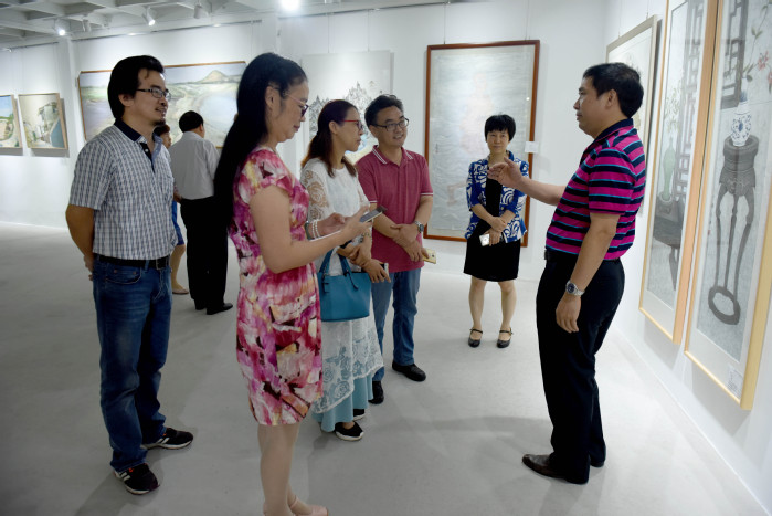 本网讯 5月24日下午,“绿动——美术与设计学院2017届毕业作品展”在我校美术馆开幕。学校校长彭永宏,党委副书记赵日兴,副校长赖美琴、刘国栋、罗川山,组织部、学生处、教务处等职能部门负责人,深圳318艺术文化投资有限公司、惠州国际展览广告有限公司等企业主管,美术与设计学院领导班子、师生代表共200多人出席了开幕式。开幕式由美术与设计学院院长杨中华教授主持。