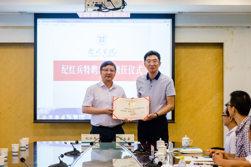 聘任仪式上,彭校长对纪红兵教授作为继王复明、夏佳文两名院士之后的第三位特聘教授加盟惠州学院表示热烈欢迎,希望纪教授能充分发挥自身平台和优势,整合我校化工学院相关资源,带动我校化工专业走向新的发展阶段,使之成为地方不可缺少、不能取代的中坚力量,更好地服务地方经济社会发展。