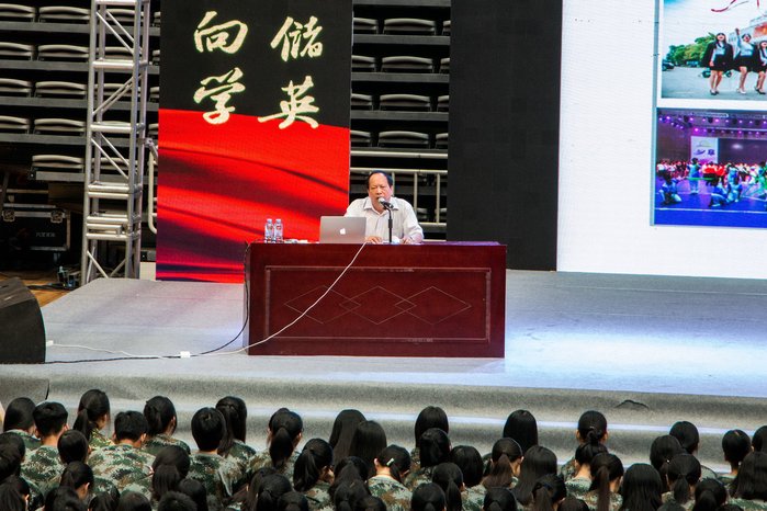 副校长刘国栋结合中华传统经典文化,为新生作了一场精彩的导学报告。他向同学们生动深入地讲解了“阆苑储英,人竞向学”校训和“敦重明辨,求真致用”大学精神的内涵和要义;通过“净、俭、苦”说明了修身致远、养德明志、广才成学的重要意义;用“玩、逃、管、弱、法”五字箴言详细解读了惠州学院学生管理规范,鼓励同学们走向教学楼、走进图书馆、走进田径场。他还就同学们如何愉快度过大学四年时光提出了七项具体建议,希望同学们能把握学习的主旋律,健康安全地成长:一是管好时间,规划时间;二是夯实基础,奔向未来;三是融入生活,热爱生活;四是善于学习,勤于思考;五是善用资源,用好资源;六是生活独立,人格独立;七是健康平安,快乐幸福。