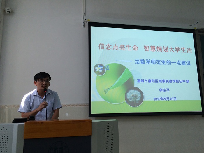本网讯 9月18日上午,数学与大数据学院特邀2003级校友、惠州市惠阳区崇雅实验学校初中部教务处主任李志平老师来校为数学学院数学与应用数学专业2017级全体新生作了一场题为“信念点亮生命,智慧规划大学生活”的励志教育讲座。数学与大数据学院党总支书记金岩,教师代表及数学专业全体新生参加了讲座。本次活动由教务处主办、数学与大数据学院承办。数学学院副院长陈益智主持讲座。