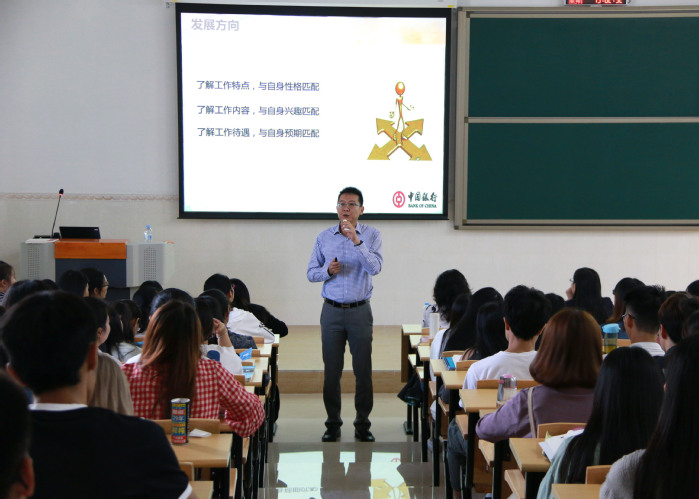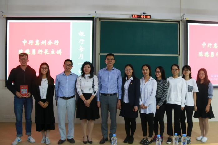 本网讯 为培养服务惠州、适应惠州经济社会发展需要的地方应用型金融人才,10月30日下午,经管学院邀请中国银行惠州分行行长陈穗勇走进“行长每月一讲”课堂,在教学实验大楼206课室为同学们讲授了《职业生涯规划和财富管理》课程。该院相关负责人、专业教师、辅导员,中国银行惠州分行人事部郑主任等参加了相关活动。