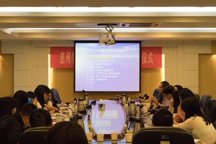 本网讯 11月7日,惠州学院首批辅导员工作室授牌仪式暨辅导员职业技能培训会在行政楼202会议室举行。校党委副书记赵日兴,各二级学院党总支书记,副书记及全体辅导员参加了相关活动。