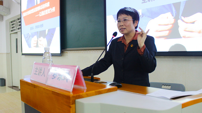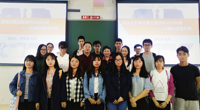 本网讯 11月15日晚,外国语学院在新教学实验大楼406课室举办创新创业专题讲座暨“卓越商务英语人才”培养系列讲座(之三)。外国语学院84届优秀校友、惠州金华悦酒店常务副总经理罗永玲应邀作了题为“浅谈企业高效营运管理体系的构建——以酒店管理为例”的讲座。该院党总支副书记邓育明,辅导员及2015、2016、2017级商务英语专业的同学参加了本次活动。
