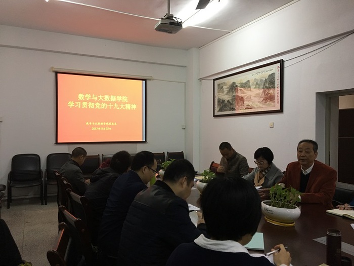 本网讯 11月24日下午,数学与大数据学院召开党的十九大精神专题学习会,部署落实有关工作。院党总支书记金岩主持会议,全体教职员工参加了会议。