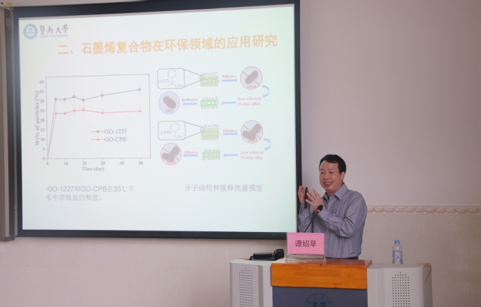 本网讯 5月11日下午,暨南大学博士生导师谭绍早教授应邀做客我校化学与材料工程学院,在实验教学大楼107室举行了一场题为“石墨烯基复合材料的设计及在环保和新能源领域的应用研究”学术报告会。院党总支书记谢伟强、副院长封科军及师生代表170余人一同聆听了讲座。讲座由副院长李浩主持。