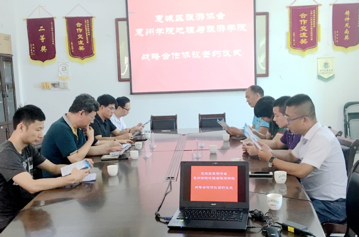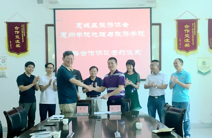 本网讯 为推动惠城区旅游业健康发展,加深校政行企合作,5月22日上午,地理与旅游学院与惠城区旅游协会在电子楼310会议室举行战略合作协议签约仪式。惠城区旅游协会会长陈旭、秘书长刘燕琼、理事邓立友,惠城区旅游局科长薛飞,地理与旅游学院院长李存、党总支书记赵卫新、旅游管理系主任刘恩波、胡杨博士和周振雄博士参加了签约仪式。