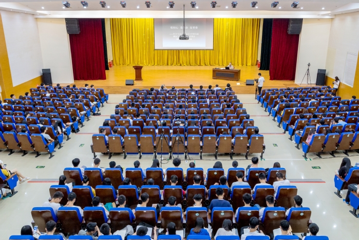 本网讯 6月19日晚,我校“学习新思想 千万师生同上一堂课”活动(学生专场)在鹅城会议厅举行,马克思主义学院杨桂森教授应邀作了题为“铭初心·强使命·绽青春——学习“习近平在北京大学师生座谈会上的讲话”的一点体会”的辅导报告。报告会由校党委副书记赵日兴主持,党委宣传部、学生处等职能部门负责同志,全体辅导员及二级学院学生代表一千余人参加了活动。