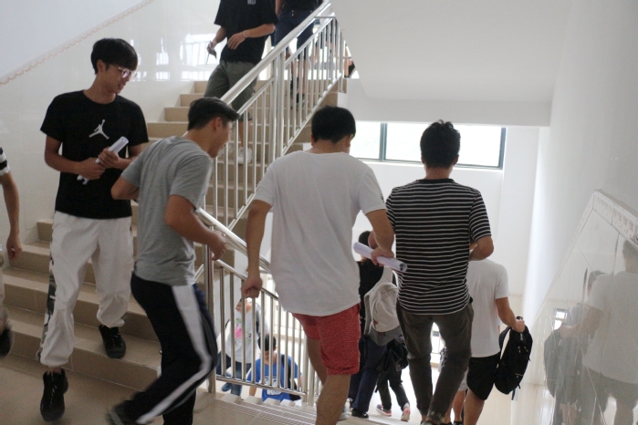 15:40,演练正式开始。604实验室准时开启烟雾发生装置,警报响起,任课老师开始指导学生们逃生,辅导员和实验主任助理在楼梯口指挥学生紧急撤离教学楼,按照指定路线安全、快速、有序地疏散到11号楼一楼停车场的安全区域。整个演习用时4分钟,取得了圆满成功。