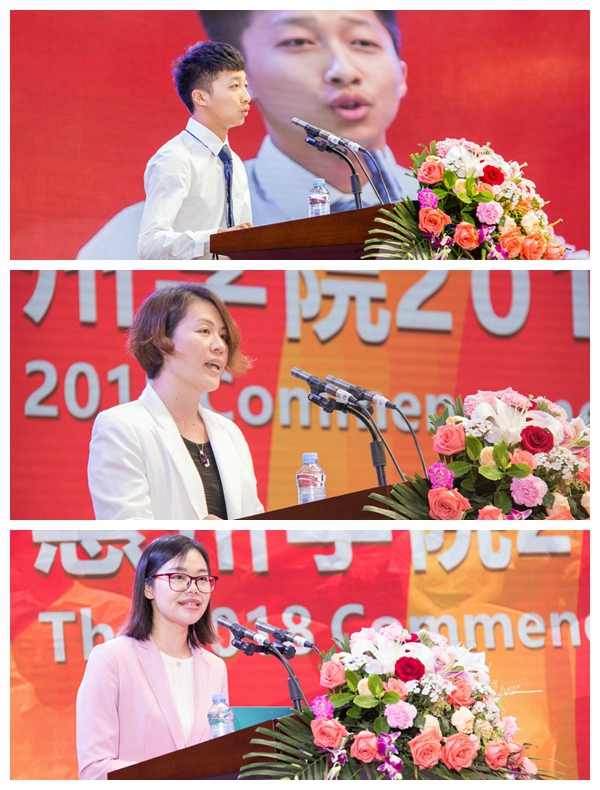在师生代表发言环节,毕业生代表、生命科学学院吴志鑫同学,教师代表、经济管理学院刘春梅老师,2010届服装设计与工程专业毕业生、华南理工大学博士后陈柔羲校友分别作为毕业生代表、教师代表和校友代表发言。
