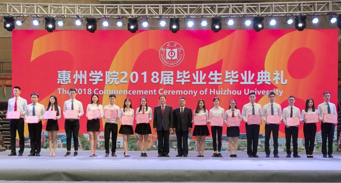 演出结束后,在校党委副书记赵日兴的主持下,毕业典礼正式开始。全场奏唱国歌,副校长许玩宏、刘国栋、罗川山分别为2018届毕业生“创业之星”颁发创业扶持金。赵日兴宣读2018届优秀毕业生和考取硕士研究生学生的表彰决定,校长彭永宏为优秀毕业生代表进行颁奖。