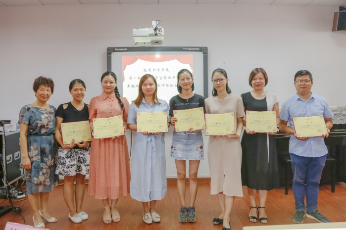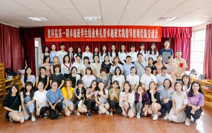 本网讯 6月29日下午,教育科学学院“卓越幼儿教师培养计划”第一期卓越班学生结业典礼暨卓越班实践指导老师经验交流会在旭日教学大楼609课室举行。院长饶淑园,学前教育主任黄国庭,第一期“卓越班”的理论导师和实践导师,卓越班的同学们参加了结业典礼,活动由副院长何资桥主持。