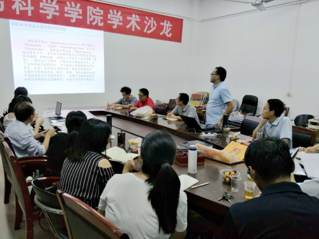 徐良雄博士简要介绍了“天然产物研究与应用科研创新团队”的组建情况,分享了国家自然科学基金的申请经验,并就“拟青霉SC0924中β-雷锁酸大环内酯的化学和生物活性多样性研究”作了专题学术报告。王玉俭博士则以“捻转血矛线虫2型半胱氨酸蛋白酶抑制剂对山羊单核细胞功能的调节”为题,介绍了相关研究成果,分享了研究经验。报告会结束后,与会教师还就相关问题展开了热烈的讨论,就2019年国家自然科学基金申请发表了各自的看法。