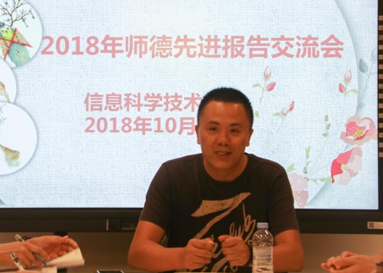 本网讯 10月10日下午,信息科学技术学院在5号楼219会议室举行2018年师德先进事迹报告会。报告会由院党总支书记张小琨主持,学院优秀教师代表兰远东博士为全体教职工作了师德报告,院全体教职工参加了会议。